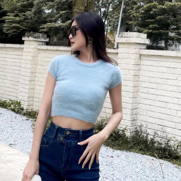 【DOE.FF】水貂毛圓領短版上衣 (現貨) 圓領上衣 短版上衣 短T 毛毛上衣 女裝 上衣女 辣妹上衣 水貂毛上衣