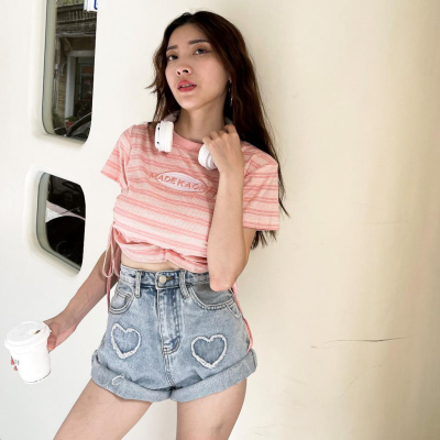 【DOE.FF】 粉色條紋刺繡抽繩短T (現+預) 圓領上衣 短版上衣 棉T 粉色上衣 短袖上衣 上衣女 粉色上衣女