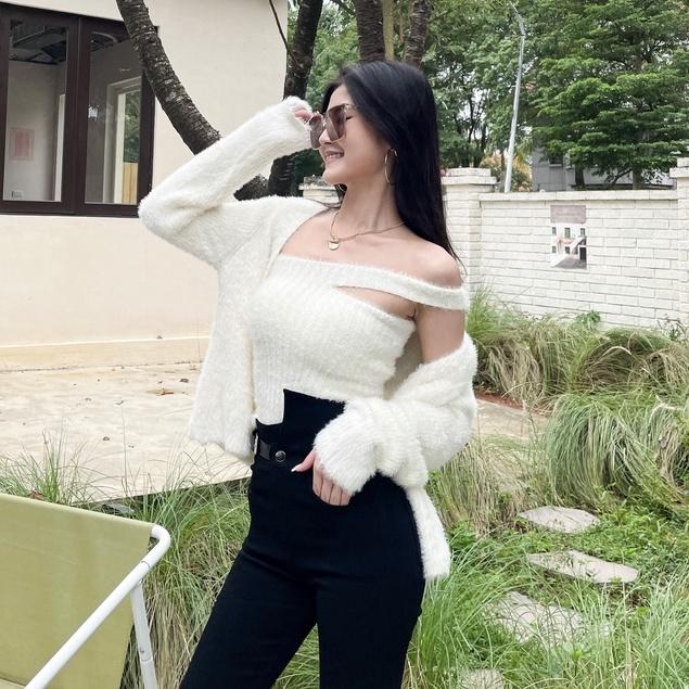 【DOE.FF】質感水貂毛兩件套(現貨)水貂毛套裝 水貂毛上衣 水貂毛外套 兩件式套裝 套裝女 短版毛衣 歐美毛衣 毛衣