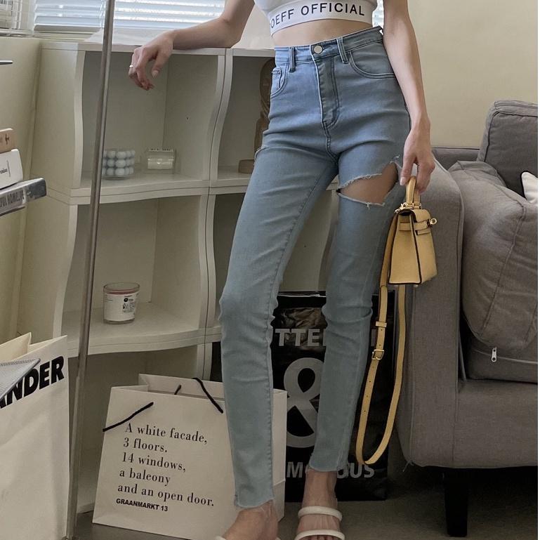 【DOE.FF】淡藍丹寧側割破小腳褲 (現貨) 緊身褲 顯瘦長褲 高腰長褲 牛仔褲 長褲女 女裝 辣妹風 小香風