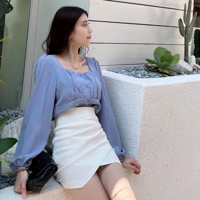 【DOE.FF】 抓皺方領雪紡上衣 (現貨) 露肩上衣 襯衫女 短版襯衫 上衣女 襯衫