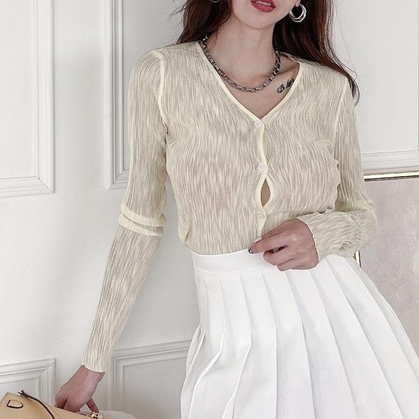 【DOE.FF】春款皺褶小鈕扣透視上衣 (現貨) 外套女 薄外套 上衣女 針織外套 針織衫 短版上衣 辣妹上衣 女裝