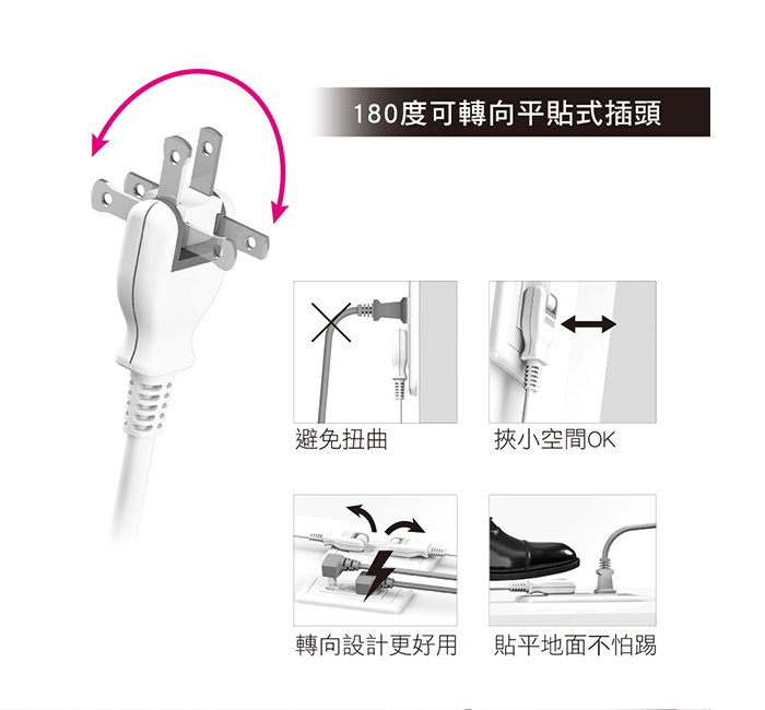 180度可轉向平貼式插頭設計,避免折損走火、不易碰撞脫落、節省空間等特色,使用延長線上更加隨心所欲,輕鬆自在。