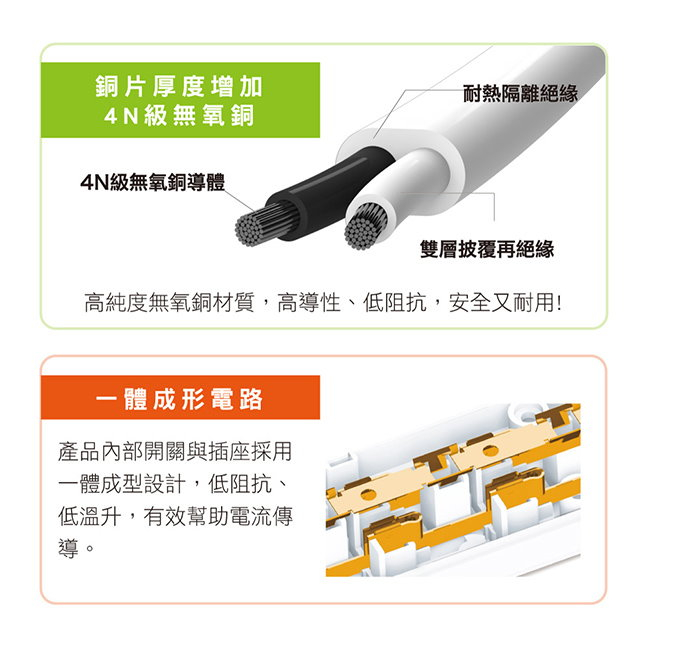 強化用電安全,全機身使用聚碳酸酯(PC)材質,可耐高溫達140度C,且不易自燃,高阻燃用料標準,安全防火又耐用!