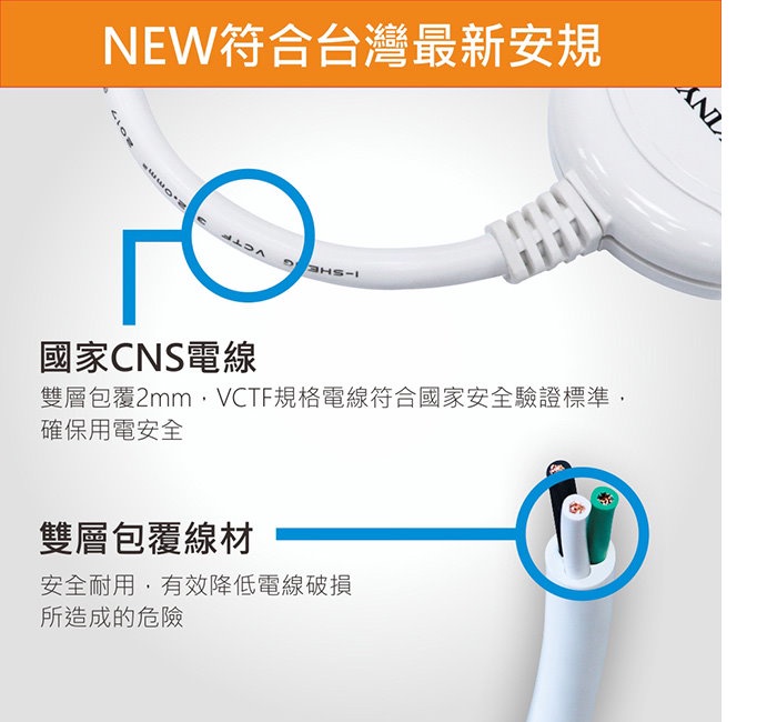 國家CNS電線,雙層絕緣被覆2.0mm2 VCTF規格電線,符合CNS國家安全驗證標準,確保用電安全。