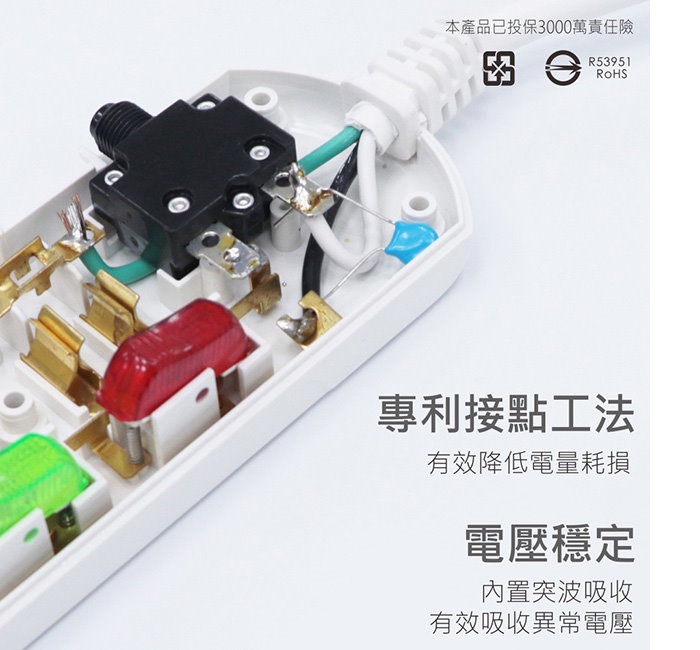 內置突波吸收裝置,可有效吸收異常電壓,穩定電流,保護電器。