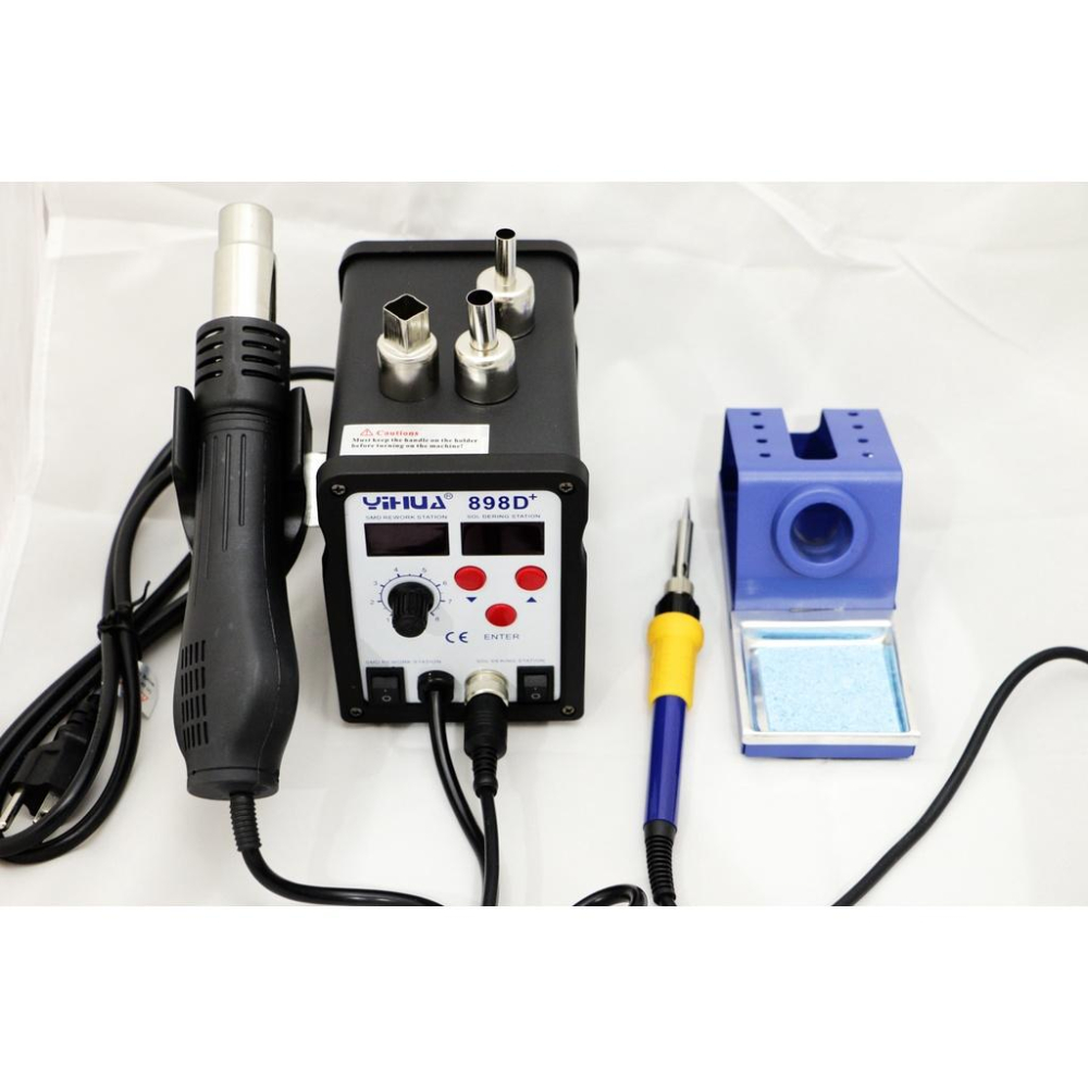 Cp值最高的產品 無刷熱風槍 低噪音 長壽命 旋風出口風量柔和,旋鈕可調風量大小,配3種出風口可換 現貨供應 台灣專用110V   可加購烙鐵頭3個常用烙鐵頭搭配購買只要150元。(898D+原廠附的是圓頭的) 非人為因素 主機保固1年, 烙鐵頭 熱風槍保固1個月.  電烙鐵手把加購一組380元 熱風槍手把加購一組550元 烙鐵第一次使用時,當溫度達到250度C時要先用焊錫幫烙鐵頭上一層錫後即可開始正常使用, 日後若烙鐵頭有髒汙須利用濕海綿清潔烙鐵頭再上一層錫以延長烙鐵頭壽命與維持操作便利性.(顧好烙鐵頭是基本技能) 特點  898D+是898D的增強改進版,具有898D所有優點的同時採用A1321進口發熱芯,增強其烙鐵部分的功能。 1.微電腦PID溫控 2.烙鐵10分鐘未使用自動進入休眠 3.大功率發熱芯 4.烙鐵 熱風槍使用耐高溫矽膠導線 , 柔軟 不會對手造成拉扯感 不會被烙鐵頭燙傷(短時間接觸) 5.機器設有保險絲與總電源開關(長時間未使用可節省待機耗電) 6.熱風槍使用無刷風機安靜壽命極長,氣流量調整線性佳  7.熱風槍手柄裝有感應開關,只要手握手柄,系統即可迅速進入工作模式;手柄放回手柄架,熱風槍便會自動啟動冷風功能,冷卻發熱芯 及保護熱風槍,待溫度低於100度C即進入待機狀態。 規格  主機重 2.2KG 熱風槍 650W 100~480dC 1dC/STEP 出風量120L/min 烙鐵 60W  200~480dC 1dC/STEP 對地電阻 <2歐姆 另有898BD+   https://shopee.tw/product/11545269/1985912612/