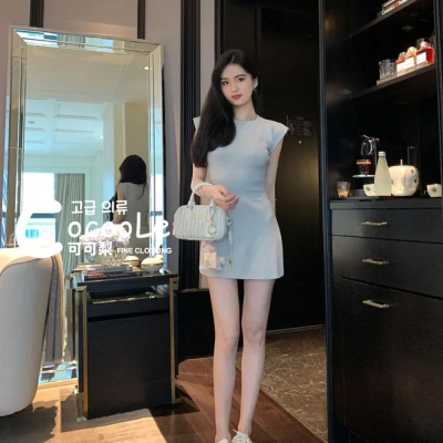 韓版🇰🇷溫柔氛圍淺灰色小飛袖收腰A字針織洋裝(超顯身材~) 夏季洋裝 氣質洋裝 收腰洋裝 A字洋裝 針織洋裝 修身洋裝