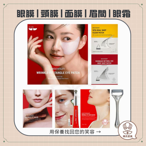 【現貨商品1~2天內出貨】 【賣場商品都是韓小編親自從韓國提回來唷】 【行李託運及寄送過程中,紙盒難免有輕微撞碰,敬請見諒】 【如需預購商品,請先聊聊韓小編,確認到貨日期後再下單】 品名: MEDITHERAPY 膠原蛋白緊緻眼膜貼 WRINKLE-FIT TANGLE EYE PATCH 品名: MEDITHERAPY 膠原蛋白網狀面膜 WRINKLE-FIT MASK 品名: MEDITHERAPY 膠原蛋白網狀頸膜 WRINKLE-FIT NECK MASK 品名: MEDITHERAPY 眉間深層微針去紋貼 SHUMAGE RETINOL 550 DEEP SHOT PATCH 品名: MEDITHERAPY 維他命微針美白貼 VITA REAL SHOT CLEAR PATCH 品名: MEDITHERAPY 電動提拉眼霜 20ml WRINKLE-FIT TANGLE EYE CREAM 來源: 韓國 門市/專櫃/免稅店 ❤️膠原蛋白緊緻眼膜貼【使用方式】 1. 撕下面膜貼膜後,將無花紋面朝皮膚方向貼在眼周或需要彈性管理的皺紋部位。 2. 20~30分鐘後,待有效成分被吸收時撕掉,輕輕拍打殘留的水分幫助其吸收。 ❤️膠原蛋白網狀面膜 / 頸膜 【使用方式】 1. 清潔臉部後使用化妝水調理肌膚紋理。 2. 取出面膜後依照臉部線條緊密貼合。 3. 約10~20分鐘後撕掉面膜,輕輕拍打肌膚上殘留的精華幫助其吸收。 ❤️眉間深層微針去紋貼 & 微針美白貼【使用方式】 1. 擦乾水分。 2. 將面膜貼輕輕貼於煩惱部位後按壓面膜貼緊密貼合。 3. 睡前請貼好,隔天清晨揭下。 (建議貼6小時以上) ❤️電動提拉眼霜 20ml WRINKLE-FIT TANGLE EYE CREAM 發現於蠶繭的高濃縮蛋白質 富含絲膠與胺基酸,與皮膚蛋白質最相似 透過熱震動改善眼周、眼袋問題 ❤️臉部按摩滾輪