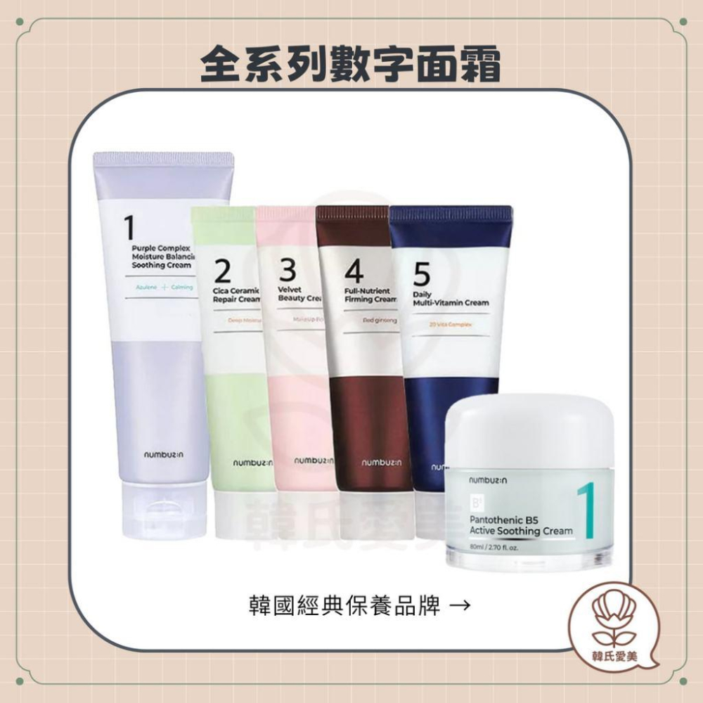 【現貨商品1~2天內出貨】 【賣場商品都是韓小編親自從韓國提回來唷】 【行李託運及寄送過程中,紙盒難免有輕微撞碰,敬請見諒】 【如需預購商品,請先聊聊韓小編,確認到貨日期後再下單】 ⭐品名: 潤碧之茵 NUMBUZIN 數字面霜 ⭐來源: 韓國 門市/專櫃/免稅店 ■ 新款 No.1 泛酸B5水潤舒緩面霜 80ml ✔️敏感肌 ✔️痘痘肌 No.1 PANTOTHENIC ACID ACTIVE SOOTHING CREAM #減少油脂分泌 #水潤保濕 #預防痘痘粉刺 【功效】 舒緩肌膚、减缓泛紅敏感 調節油水平衡 深層幫助肌膚降溫 130小時保持水潤/鎮定肌膚 ■ No.1 甘菊藍水潤舒緩面霜 100ml No.1 Purple Complex Moisture Balancing Soothing Cream 100ml #舒緩三重奏 #水潤保濕 #油水平衡 【功效】 舒緩肌膚不適補充水分 幫助肌膚層層鎖水 調節油水平衡 抗氧化 减缓泛紅敏感 深層幫助肌膚降溫 敏感肌膚適用 痘痘肌膚適用 14種舒緩成分 + 5種降溫成分 ■ No.2 皮膚深層修護面霜 60ml No.2 Real Ceramide Cream #神經酰胺 #EWG全綠等級 【功效】 肌膚滋養保濕 強化肌膚保護力 舒緩敏感肌膚 積雪草成分 不油不黏膩, 延展性強好推開 ■ No.3 絲綢之路美妝面霜 60ml No.3 Velvet Beauty Cream #彈力光澤萬能面霜 #化妝細膩服帖 【功效】 維持肌膚光澤亮麗 保濕滋潤不油膩 提升肌膚潤澤度 緊緻收斂毛孔 恢復肌膚彈性 提升妝容服貼持久度 美白、淡化皺紋雙重機能性保養品 ■ No.4 高麗紅蔘保護膜面霜 60ml No.4 Full-Nutrient Firming Cream #高濃縮紅蔘39% #抗氧化 【功效】 撫平皺紋 淡化暗沉亮白肌膚 恢復肌膚彈性 保濕營養供給 39%高濃度紅蔘萃取 提亮、淡化皺紋雙重機能性保養品 ■ No.5 每日綜合維他命面霜 60ml No.5 Daily Multi-Vitamin Cream #塗抹的綜合維他命 #3重美白 #肌膚健康 【功效】 改善暗沉肌膚 給予肌膚所需營養 潤澤保濕補水 維持肌膚彈力緊緻 舒緩敏感肌 抗氧化 改善黑色素沉澱 22種維他命成分 + 27種營養成分