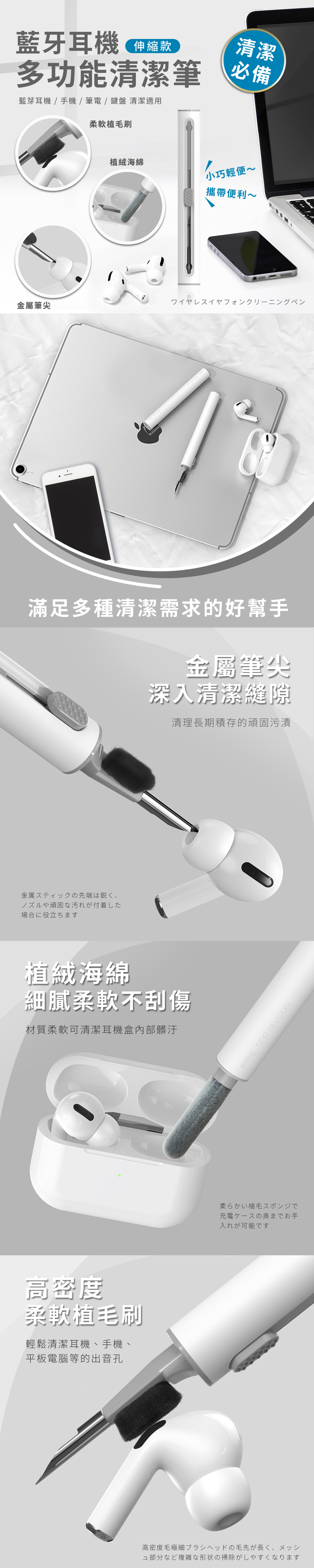 開關向上推,露出筆尖,金屬筆尖用於清潔機器縫隙裡的髒污,毛刷用於清潔機器的顆粒污垢。
