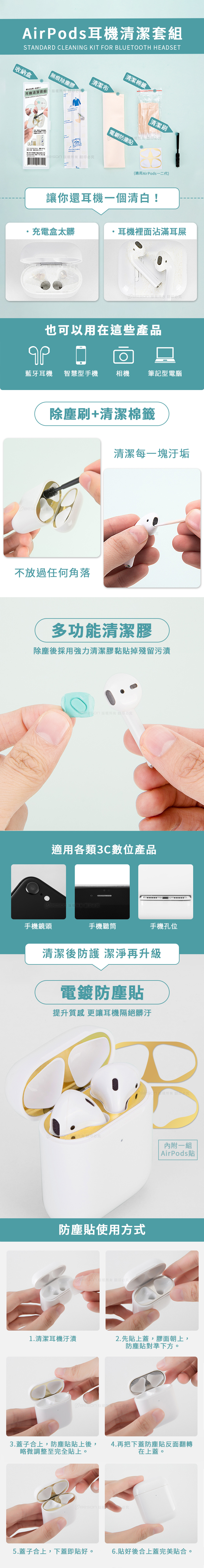 內容物:清潔布/清潔棉籤/清潔刷/除塵膠(丁基橡膠)/電鍍防塵貼(適用AirPods一二代)