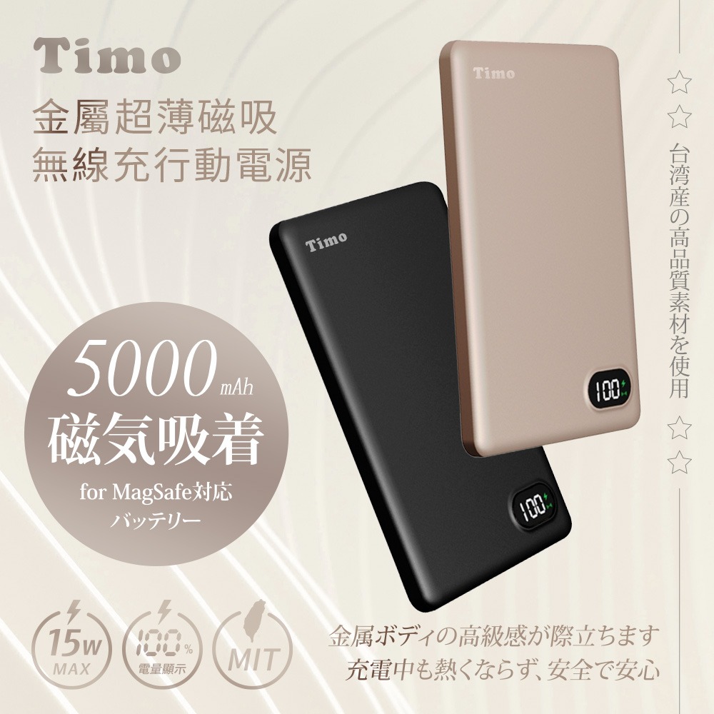 【Timo】PD快充 數顯金屬超薄磁吸無線充行動電源 5000mAh