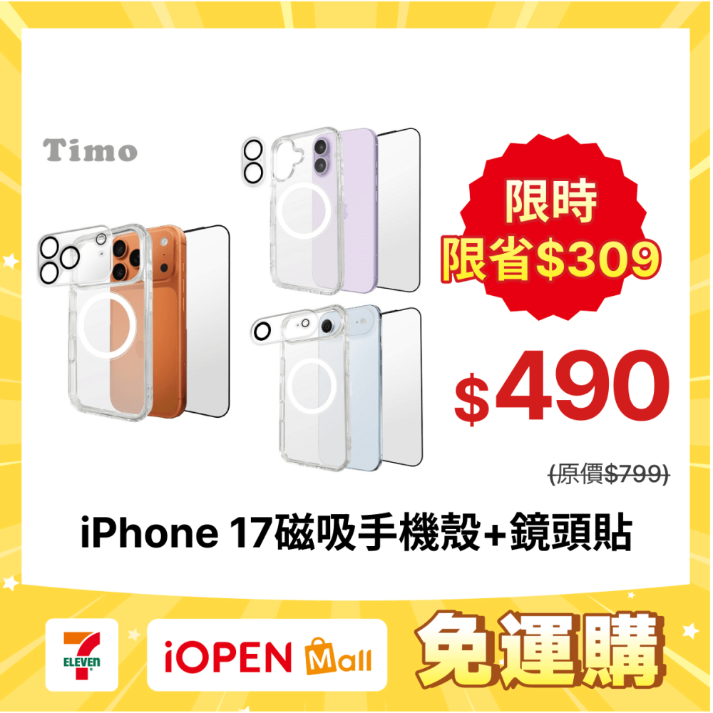 【7-ELEVEN 門市團購】Timo iPhone 17 系列 磁吸防摔手機殼+鏡頭貼+螢幕貼