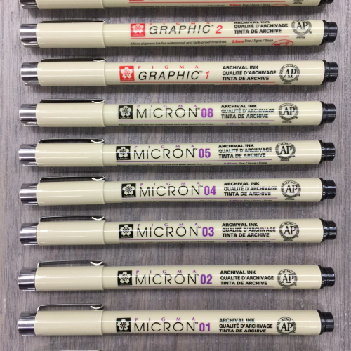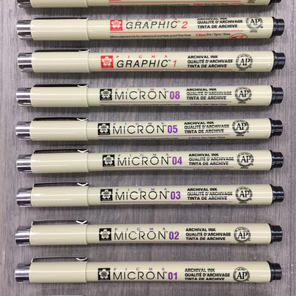 代針筆墨水為黑色,有0.03mm、0.05mm、0.1mm、0.2mm、0.3mm、0.4mm、0.5mm、0.8mm、平1.0mm、平2.0mm、平3.0mm共11種規格