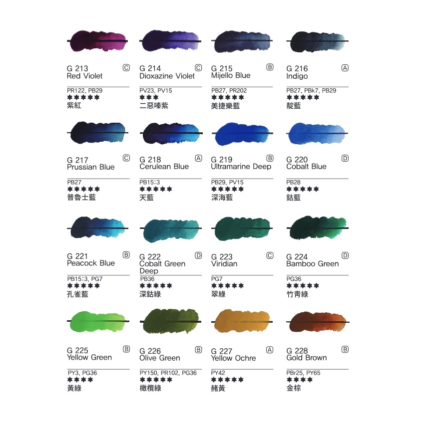 全色系34色中更有32色耐光性級別達4星以上讓您的創作無退色之虞,混合白色後,可以產生更多的文明色系,更強的覆蓋力、提高了不透明性。