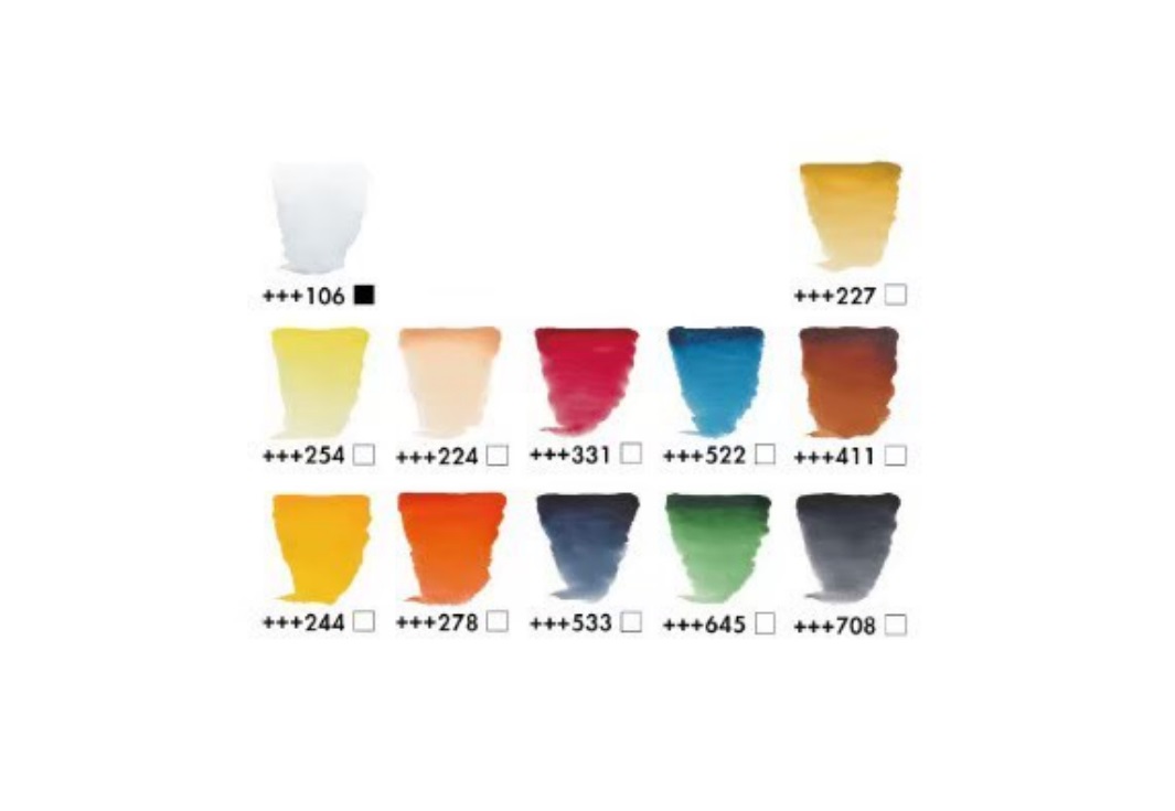 331 Madder Lake Deep - 533 Indigo - 522 Turquoise Blue - 645 Hooker Green Deep - 227 Yellow Ochre -