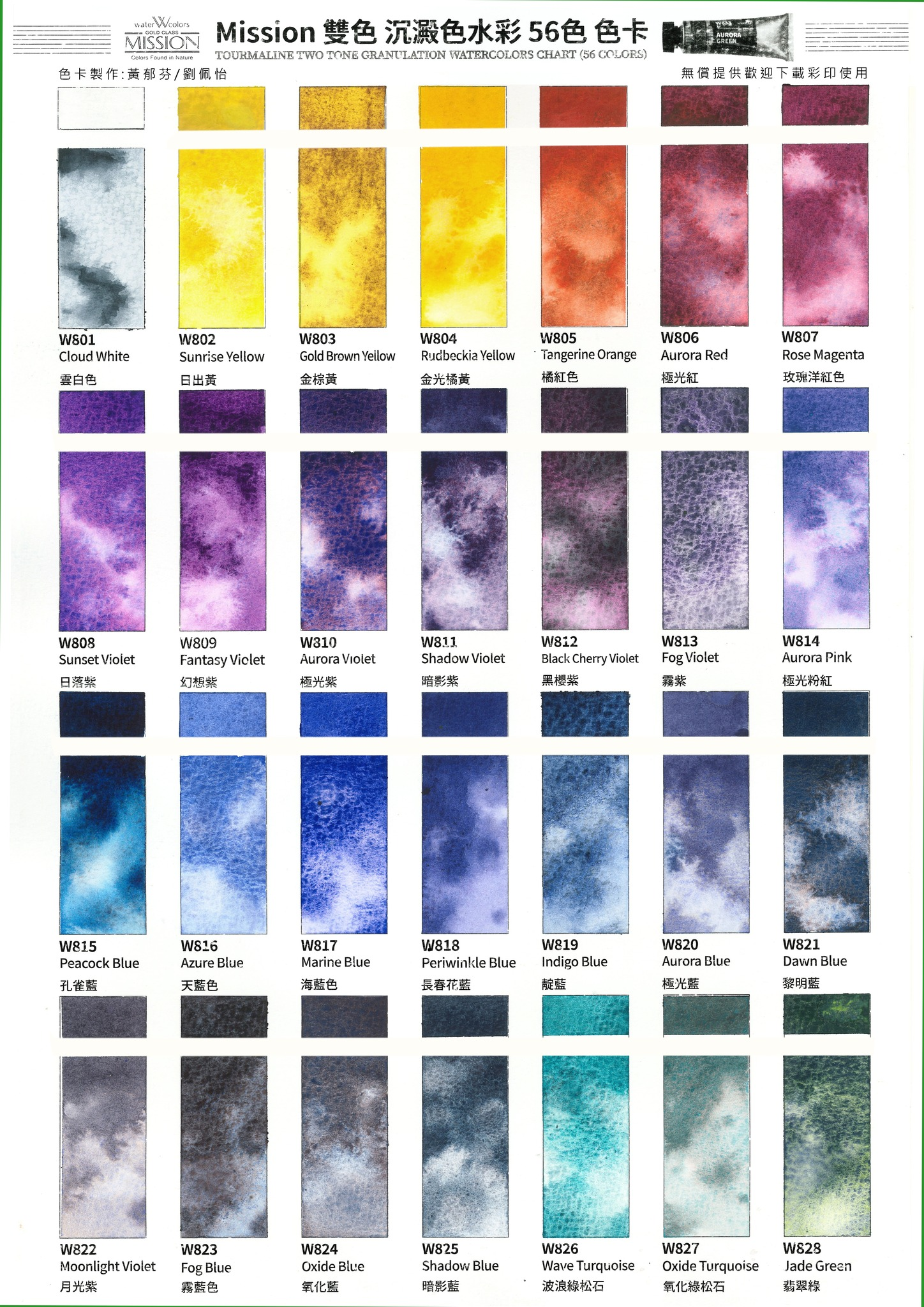 影片中,將介紹Mission Tourmaline Two Tone Granulation雙色 沉澱色水彩,運用不同的水分多寡將會呈現不一樣的沉澱雙色效果質感!