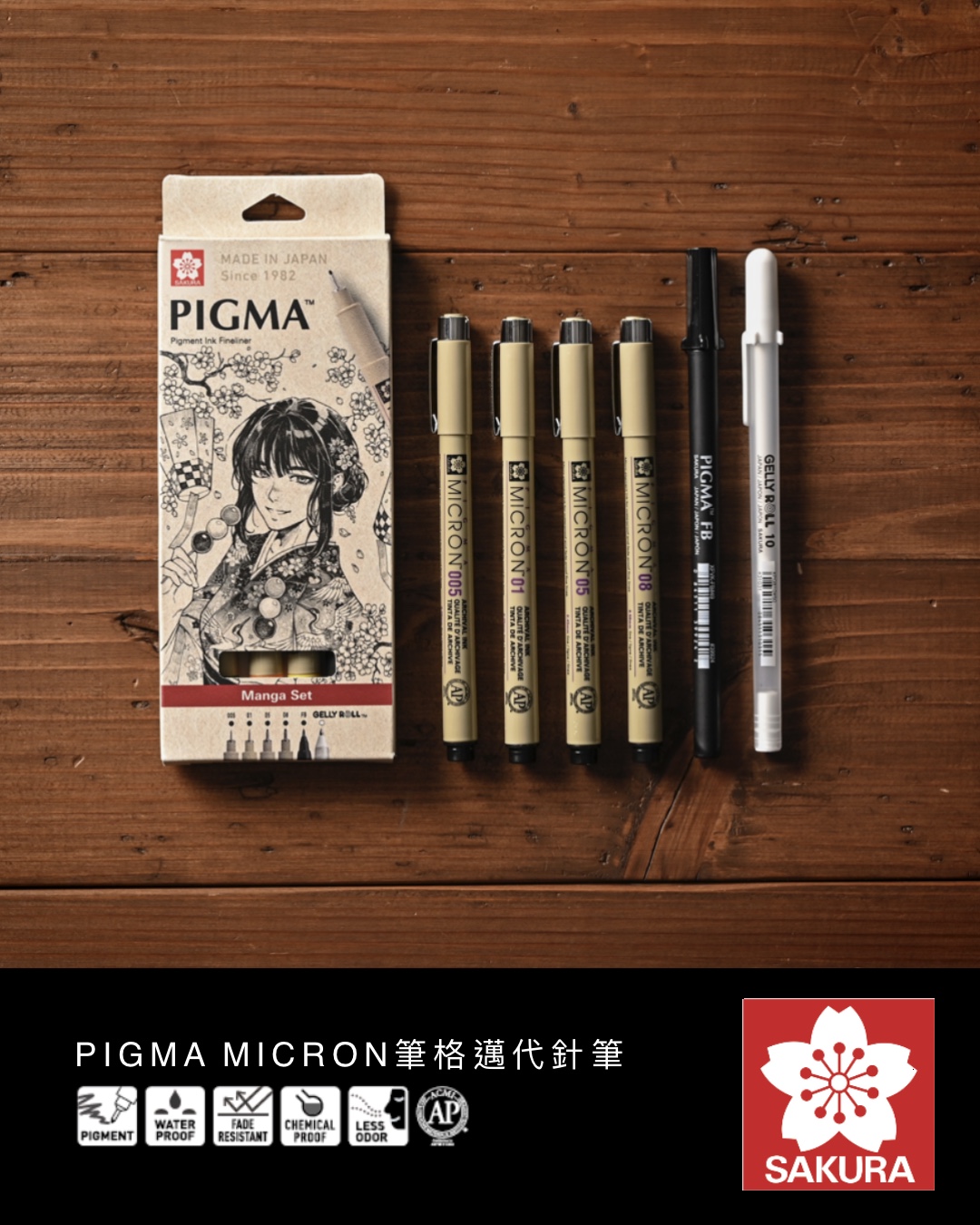 盒裝: 筆格邁代針筆0.05、0.1、0.5、0.8 / PIGMA 軟毛筆 / 櫻花白色牛奶筆