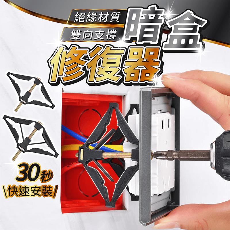 轉動螺絲,撐開兩端使其頂部變長,讓修復器頂住兩端並固定,以防止鬆動脫落。輕鬆解決鏽蝕斷耳、開關盒、老舊暗盒輕鬆換新。