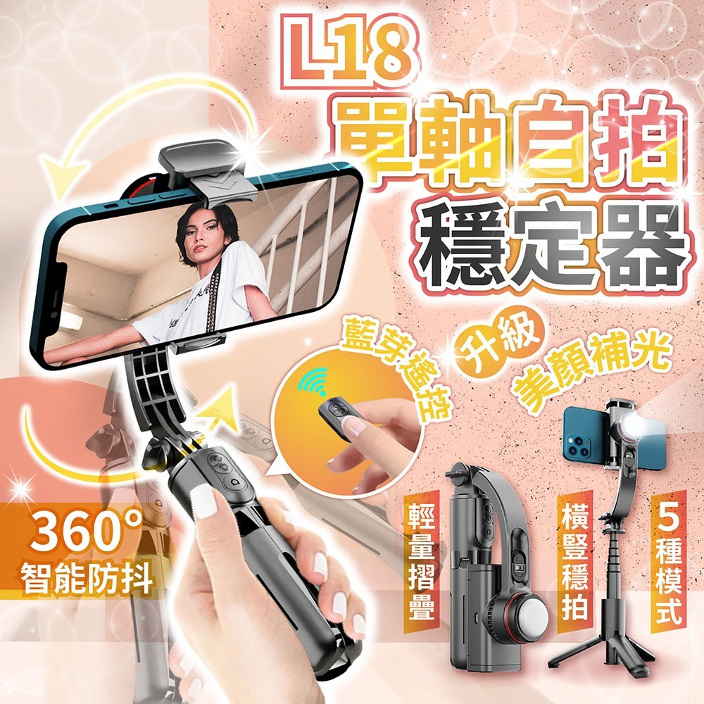 【L18 單軸自拍穩定器】集穩定器、自拍棒、腳架、補光燈於一身,輕巧可摺疊,隨時隨地拍出電影感。