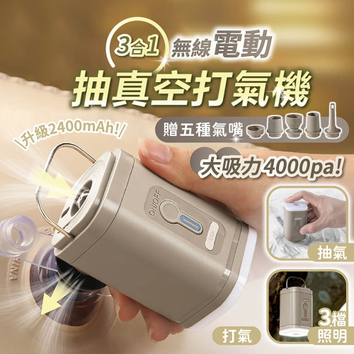 💨 三合一功能:打氣 / 抽真空 / 露營燈,一機多用