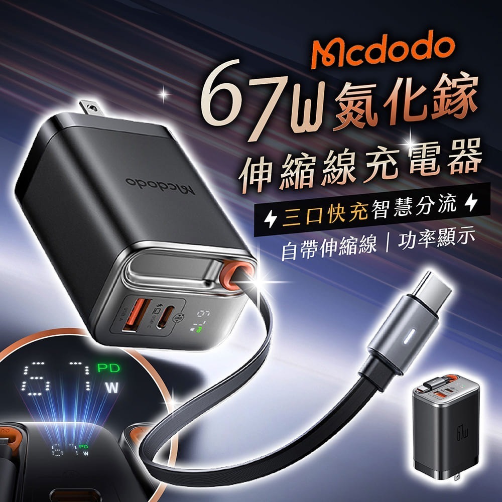 這款【Mcdodo 67W 氮化鎵伸縮線充電器】,