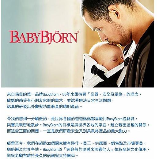 來自瑞典的第一品牌BABYBJÖRN,1961年創立以來已50年,多年來秉持著「品質、安全及風格」的理念,BABYBJÖRN感受到有小孩的家庭需求,試著解決日常生活問題,認真的研發出外觀與功能兼具的產品。 符合FDA(FOOD AND DRUG ADMINISTRATION)的認證,可以放入洗碗機清洗。 軟膠防碎屑圍兜是符合幼兒人體工學設計的圍兜。 頸部設計成可調整的項鍊式的連續扣鍊,可以調整成符合幼兒的需要的寬度。 底部的立體口袋可接住固態食物的碎屑或液態食物的汁液。 無毒安全,採用可回收材質,無PVC 絕不會對寶寶產生毒害 尺寸:21 x 26 x 7cm 重量:60克 材質:熱可塑彈性體,耐用可回收的材質(無林苯二甲酸,無PVC) 產地:瑞典 https://www.youtube.com/watch?v=ltzrCOvxjBs#action=share 產品介紹
