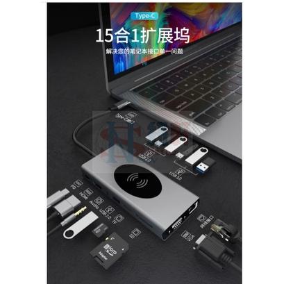台中現貨 十五合一Type-C擴展塢USB-C轉HDMI網口VGA集線器HUB手機無線充