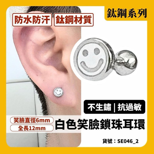 現貨 實拍 白色 smile 銀框 笑臉 鎖珠 耳環 鈦鋼 抗敏 微笑 可碰水