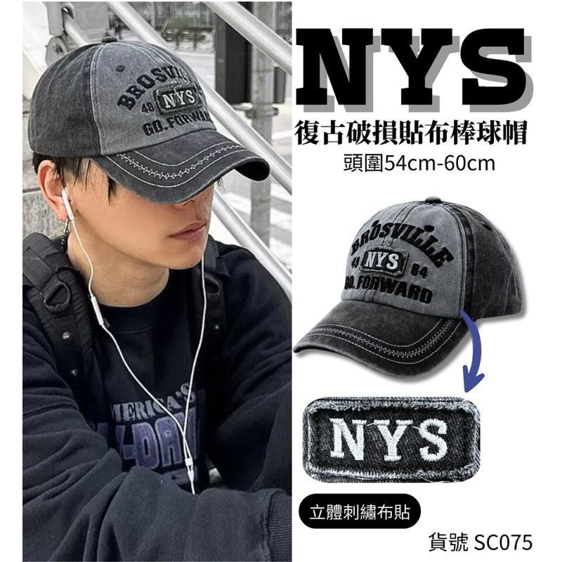 現貨 韓國同款 NYS 復古棒球帽老帽 帽子 帽子男 男生帽子 破損 貼布 彎檐帽 個性 棒球帽 破壞 仿舊 拼接 刺繡