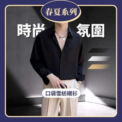 現貨3色 時尚氛圍 雪紡襯衫 長袖襯衫 男生襯衫 口袋 白襯衫 黑襯衫 大地色 白色 襯衫 黑色 垂墜感 短袖 素面