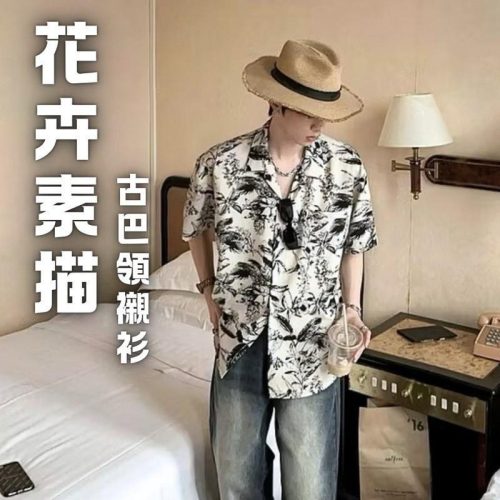 現貨 細節實拍 花卉素描 古巴領 短袖 襯衫 男 上衣 花襯衫 海島 ST033