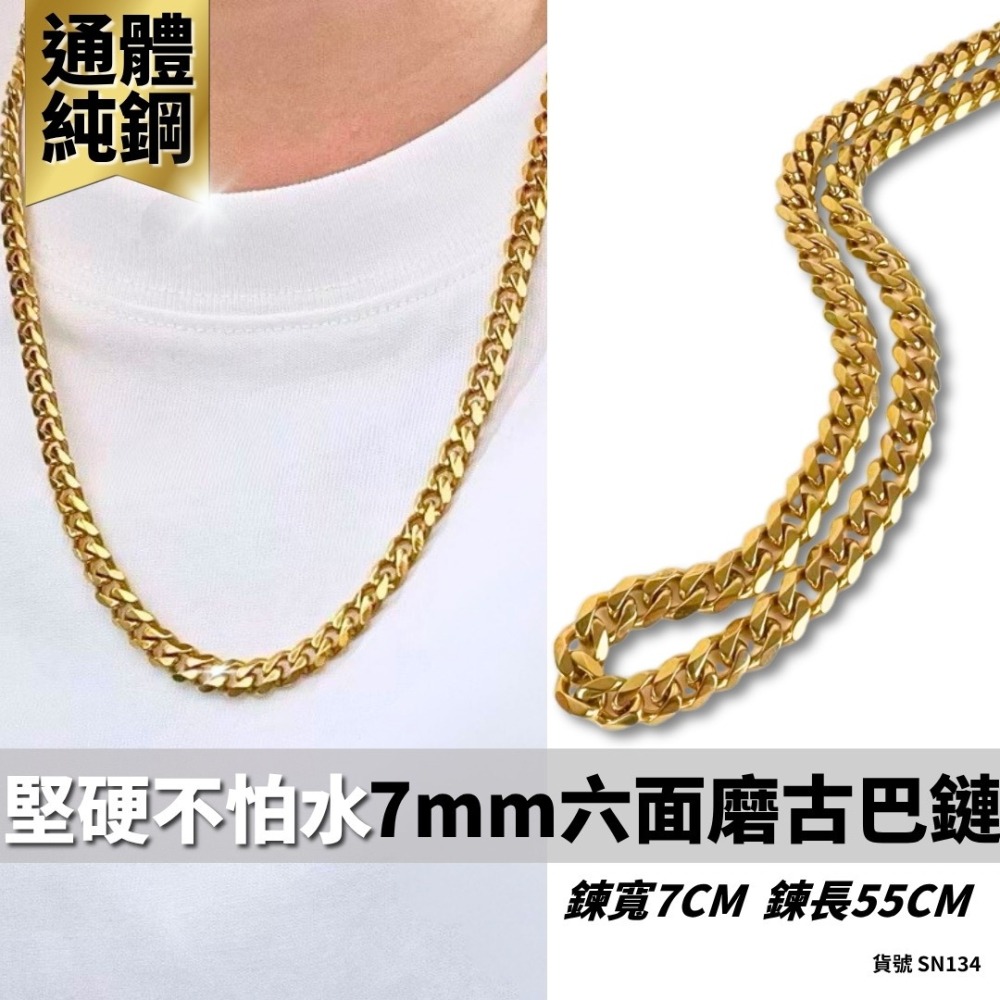 現貨 實拍 金色 7mm六面磨古巴鏈 鈦鋼 粗鍊 男生項鍊 金色 SN134