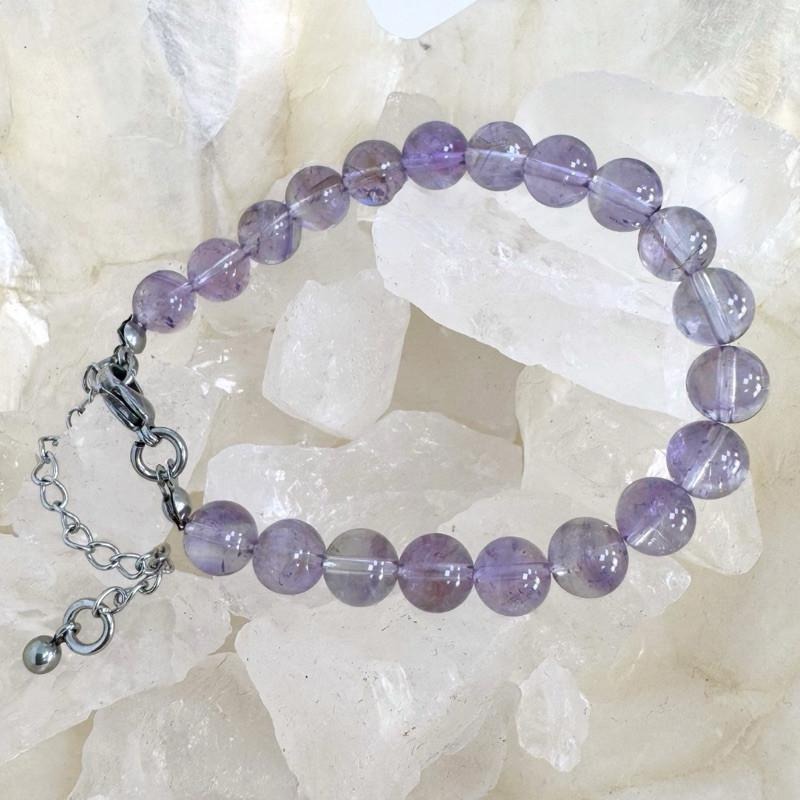 顏色:天然透明淡紫色 材質:天然紫幽靈+鈦鋼 尺寸(± 1-3cm):寬0.7cm  總長22cm 有6cm長度可調節 https://s-cf-tw.shopeesz.com/file/tw-11134208-7rbka-m8eq4klxeuyh9e 📦📦📦購買前請詳閱賣場介紹