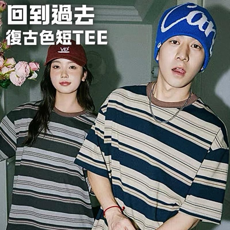 現貨 2色 單品實拍 回到過去 條紋短袖 大地色 寬鬆 短tee 復古 男生 情侶 上衣 落肩 咖啡色 情侶上衣