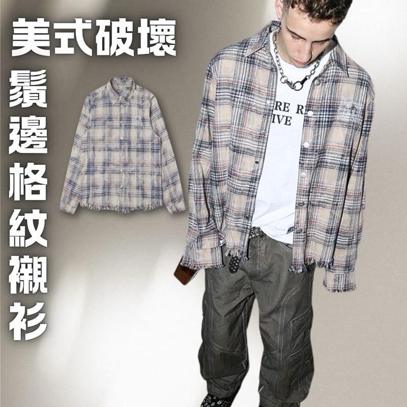現貨 實拍 美式破壞 鬚邊 格紋襯衫 毛邊 男 長袖 格子衫 ST030