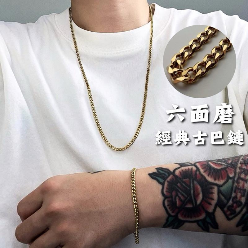 現貨 實拍 經典六面磨古巴鏈 鈦鋼 男生項鍊 手鍊 金色