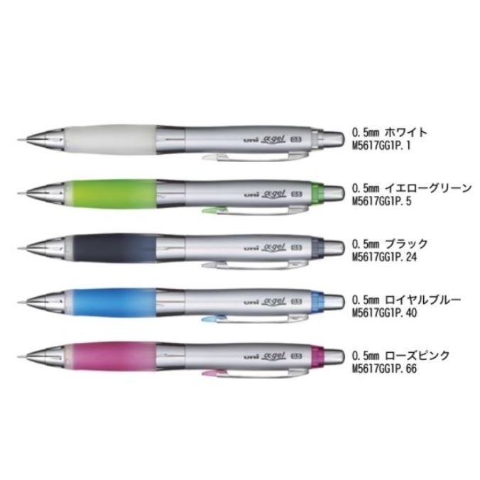 UNI 三菱 α-gel M5-617GG 阿發自動搖搖鉛筆 (6色可選) 輕鬆搖搖,上下搖一搖,筆芯自動滑出! 產品特色: α-gel材質超柔軟,手指不易長繭。 輕鬆上下一搖,筆芯自動滑出。 超軟握炳,質地柔軟好握好拿。 鉛芯上鎖構造,不怕鉛芯亂跑。 鋁材質筆桿,採低重心設計。 強力筆夾攜帶方便。 筆帽附小型橡皮擦。 書寫筆芯 : 0.5mm 顏色 白 黃綠 黑 寶藍 玫瑰粉紅