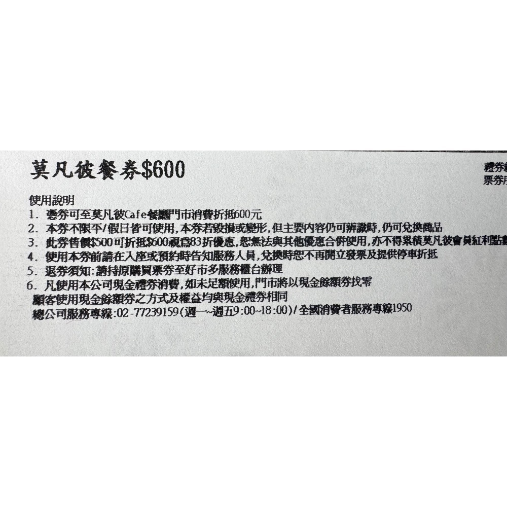 1.憑餐券可至莫凡彼Cafe餐廳門市消費折抵600元。