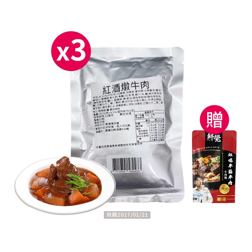 成份:水.牛肉(巴拉圭).白蘿蔔.胡蘿蔔.蕃茄糊.切角蕃茄(蕃茄.蕃茄汁.檸檬酸.氯化鈣.食鹽).紅酒.糖.雞汁(水.鹽.雞肉萃取物(雞肉萃取物.鹽).L-麩酸鈉.糖.雞油.酵