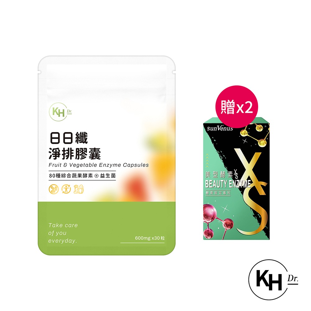 成分:酪酸菌、蘋果纖維、玉米來源可溶性纖維、(金針菇濃縮萃取液、麥芽糊精)、菊苣纖維、羊角豆萃取物(麥芽糊精、羊角豆萃取物)、綜合蔬果發酵物(含糊精、昆布、裙帶菜、紫菜、香菇、檸檬馬鞭草、苦艾、西番蓮、金盞草、大飛揚草、牛筋草、檸檬草、大茴香、馬黛茶、魚腥草、紫蘇、薰衣草、貓薄荷、洋甘菊、生薑、益母草、芭樂葉、丁香、咸豐草、迷迭香、燕麥片、玉米、大麥、豌豆、紅豆、薏仁、芝麻、刺槐豆、小米、大豆、爆裂玉米、黑麥、黑豆、鷹嘴豆、扁豆、糙米、鳳梨、香蕉、蘋果、木瓜、芭樂、哈密瓜、酪梨、梅子、西印度櫻桃、檸檬、葡萄乾、芒果、楊桃、西瓜、腰果、核桃、奇異果、西洋梨、巴西莓、卡姆果、萊姆、玫瑰果、橘子、樹莓、柳橙、水蜜桃、蘿蔔、高麗菜、蓮藕、牛蒡、菊苣、甘藷、南瓜、木薯、番茄、羽衣甘藍、青椒、紅甜菜、胡蘿蔔、長型南瓜)、酵母粉、綜合酵素(蛋白質分解酵素 4.5、麥芽糊精、澱粉分解酵素、葡萄糖澱粉酵素 RO、脂肪分解酵素、轉化酵素、鳳梨酵素、蛋白質分解酵素 3.0、纖維素分解酵素 AN)、二氧化矽、硬脂酸鎂。