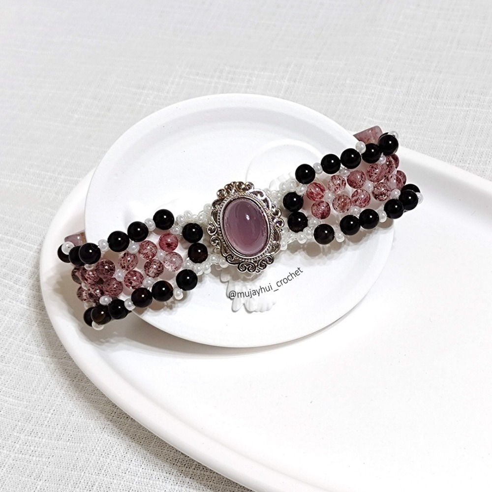 以敦煌極光瑪瑙手排為基底,搭配金草莓晶與黑瑪瑙,交織出堅強卻不失細膩的氛圍。