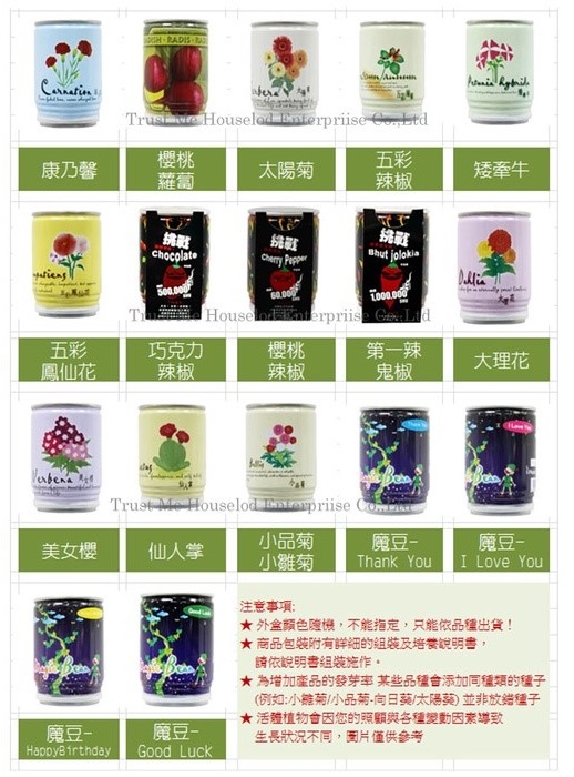 商品內容:罐頭*1、蓋子*1(組裝後為水盆)、蛭石土壤、長效緩釋性肥料、種子數顆、使用栽培說明書