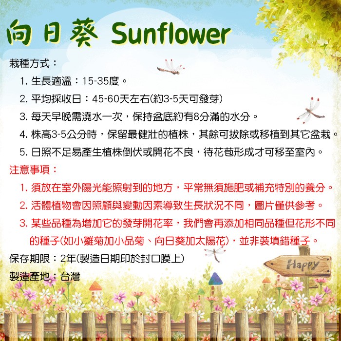 2.每一種種類適合的栽種氣候溫度不同,請依說明書施種。