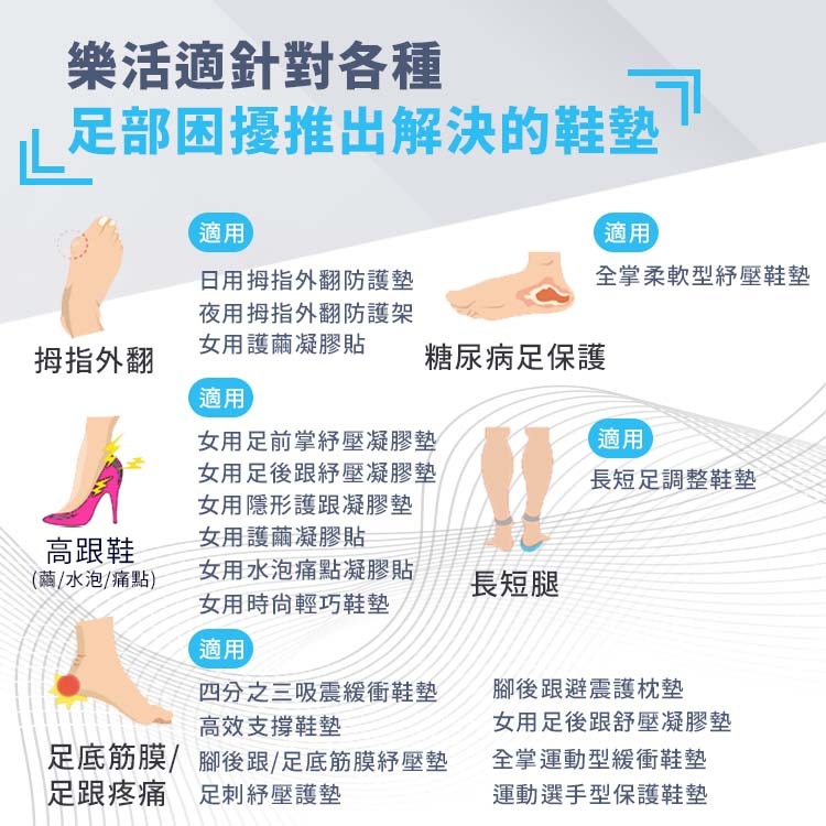 •有助於預防及緩解足底筋膜不適。推薦對象:長時間站立/步行、足底結繭、雞眼、筋膜炎、腳底疼痛、