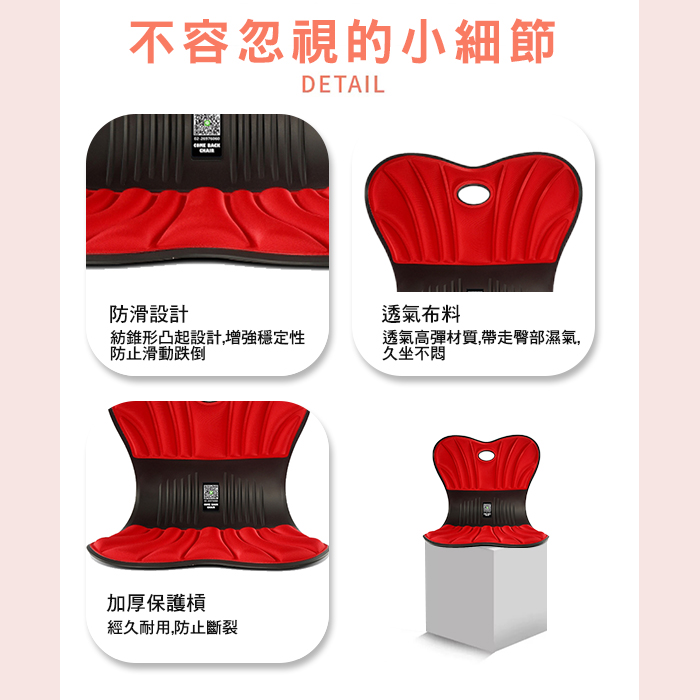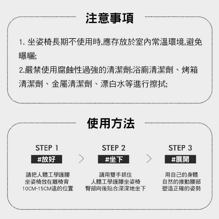 使用方法:使用時,將坐墊放置於離靠背一定間隔距離的位置,放穩後坐下即可。