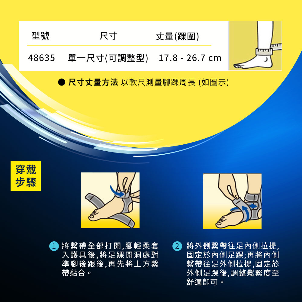 ◆穿戴時請穿著低跟包鞋或運動鞋,為增加穿戴效果及舒適性,建議先穿襪子後再穿戴護具。