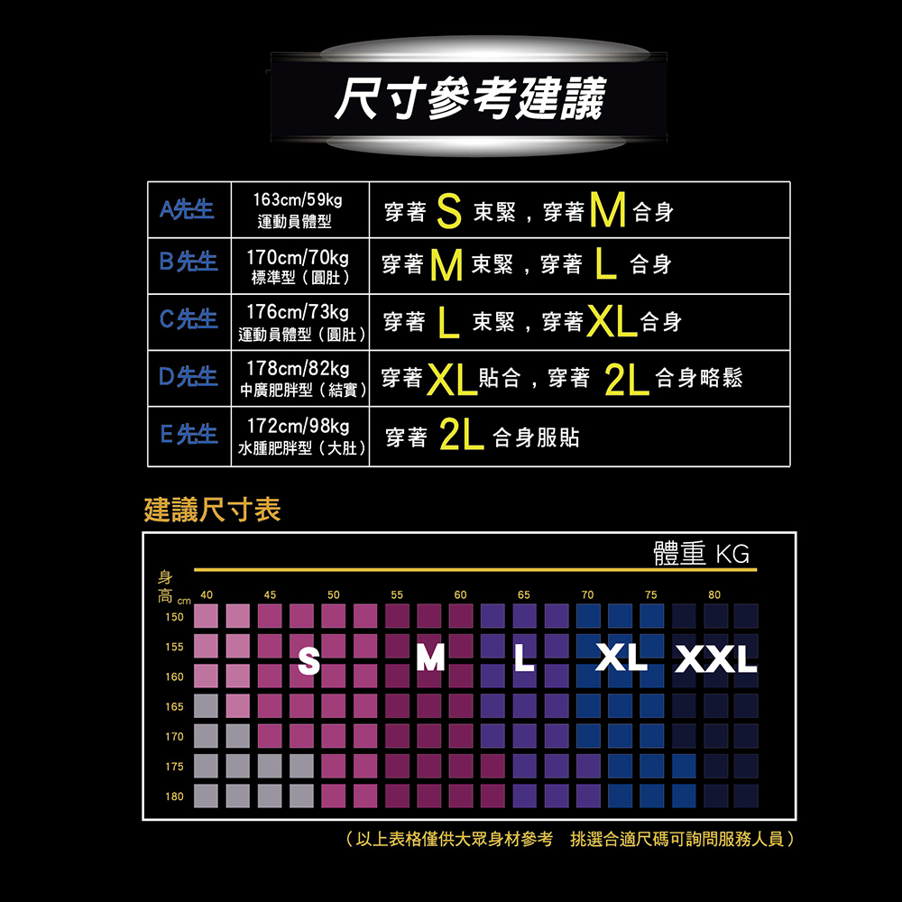 178cm/82kg中廣肥胖型 穿著XL 貼合,穿著 2L 合身略鬆