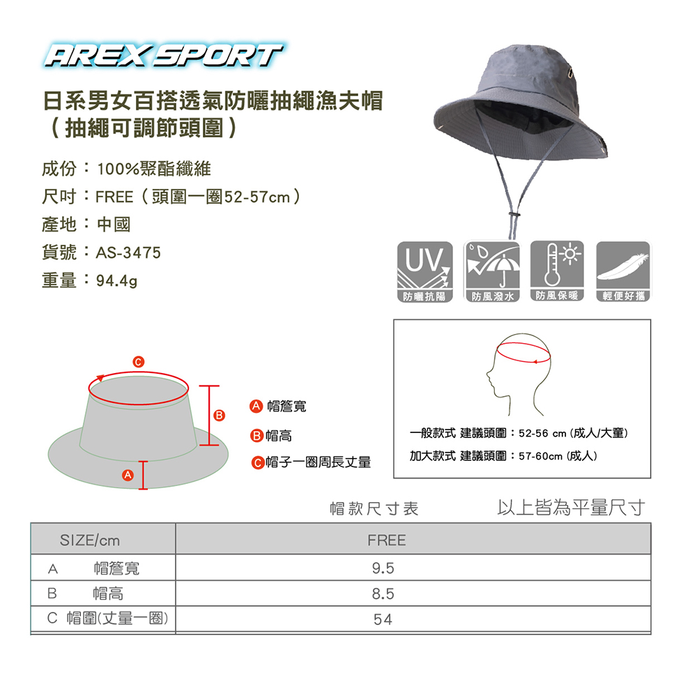 適合頭圍: FREE(帽圍:52-57cm / 帽簷:9.5cm / 帽深:8.5cm)